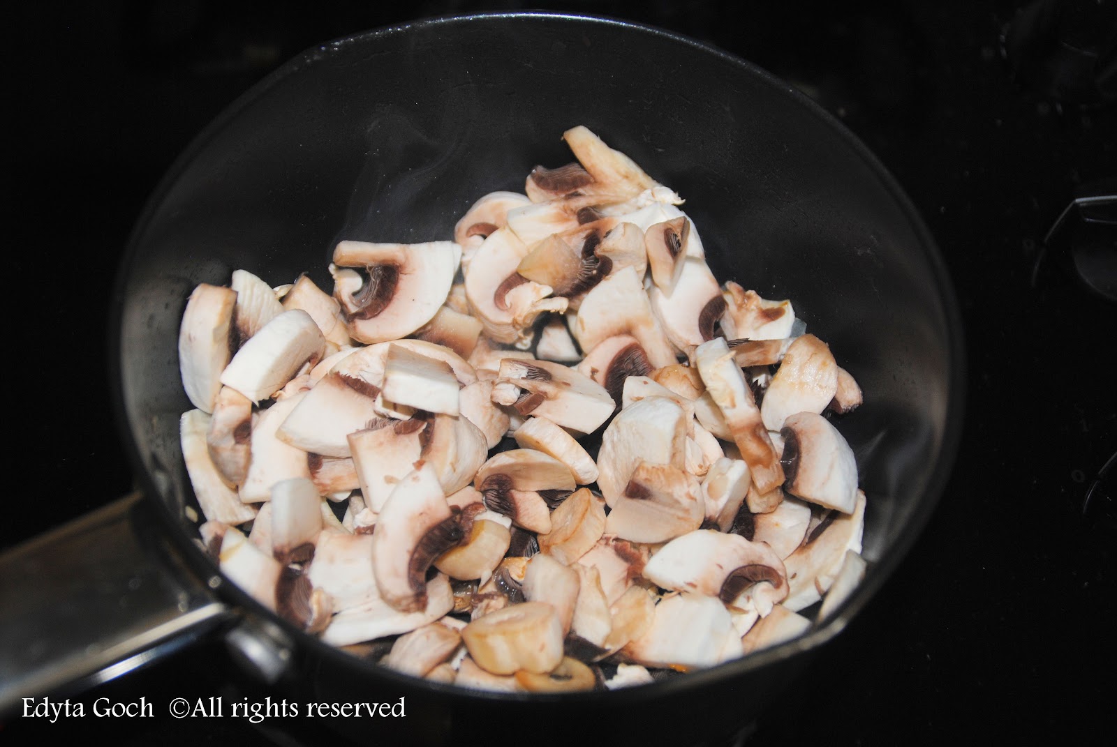1) usunąć masło. Podmazyc na spryskanej olejem patelni , dolać kilka łyżek (3-4) wody i dusić, zarówno pieczarki jak i kurki.
